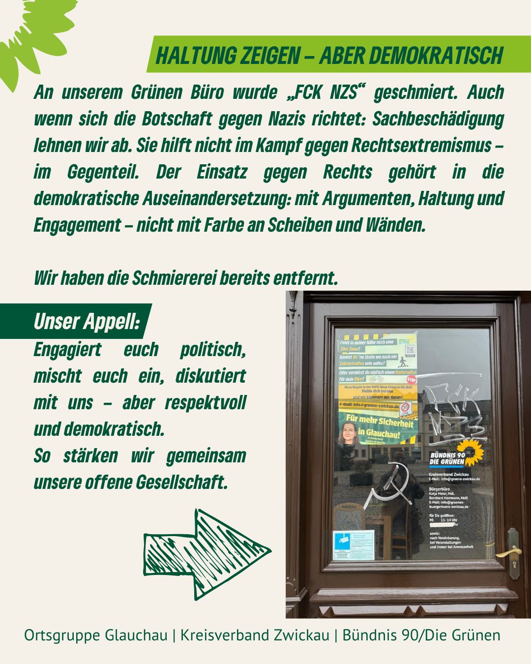 Dr. Mandy Bauch und die Grüne Ortsgruppe Glauchau Grünes Büro beschmiert 28. Dezember 202528. Dezember 2025 Haltung gegen Rechts zeigen - aber demokratisch